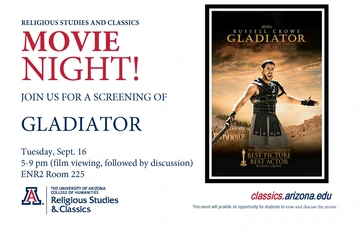 The Department of Religious Studies & Classics will be having a screening of GLADIATOR on Tuesday, September 16, 2025 from 5:00pm to 9:00pm.